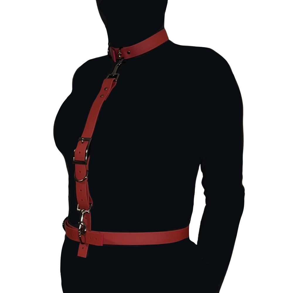 Uprząż III HARNESS marki SxToys to elegancki i funkcjonalny system bondage dla osób, które pragną eksplorować władzę, podporządkowanie i kontrolę w zmysłowym stylu. Składa się z 3 perfekcyjnie zaprojektowanych elementów: regulowanej obroży na szyję z metalowym D-ringiem, szerokiego pasa na talię oraz centralnego paska łączącego oba te elementy za pomocą solidnych karabińczyków. Każdy fragment tej uprzęży został wykonany z wodoodpornego, wytrzymałego materiału w intensywnie winno-czerwonym kolorze, z kontrastującymi, stalowoszarymi okuciami, które przyciągają wzrok i wzmacniają dominujący charakter akcesorium.